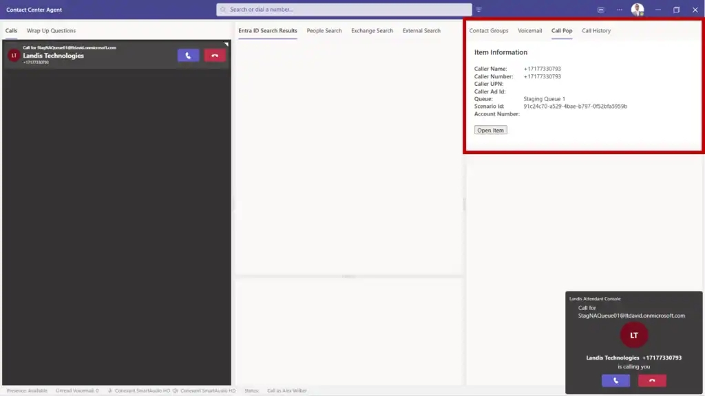 Call pop functionality configured in Landis Contact Center now also works in Attendant Console. When a call comes in through a Contact Center queue, the call pop will display in Attendant Console automatically based on your Contact Center settings. No additional configuration is needed in Attendant Console.